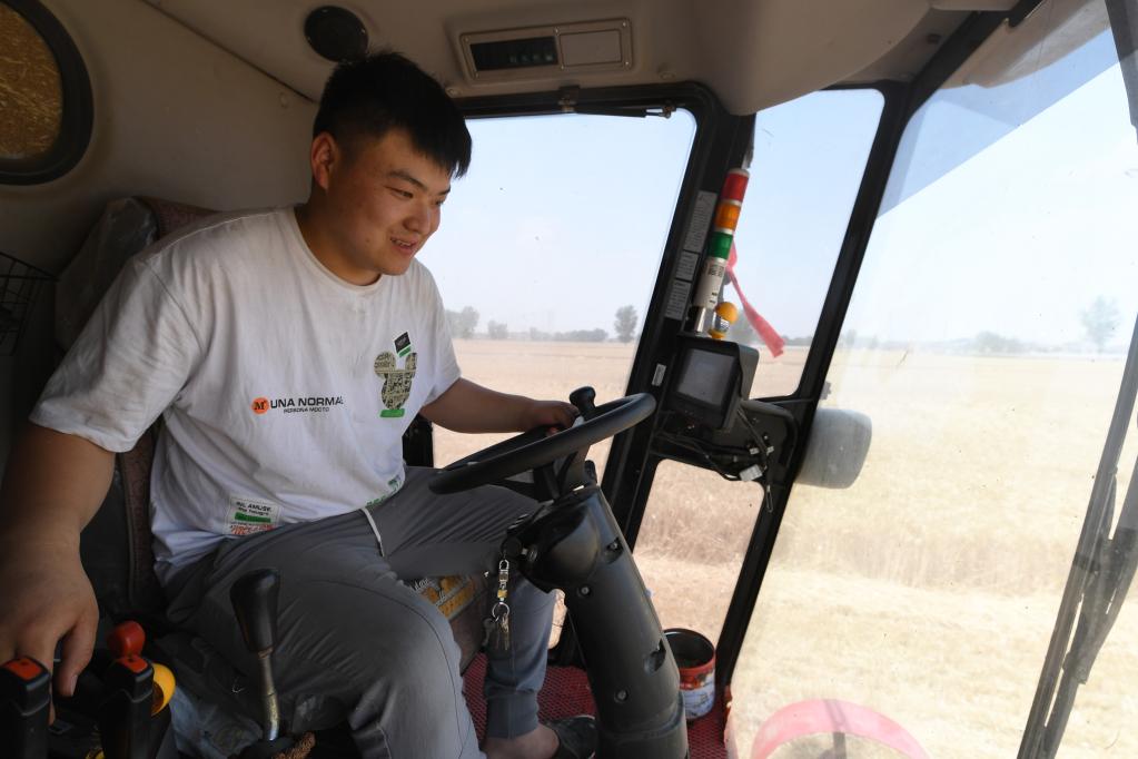 6月2日,在河南省周口市扶沟县练寺镇下马刘村,刘家骏在驾驶收割机作业。新华社记者张浩然 摄