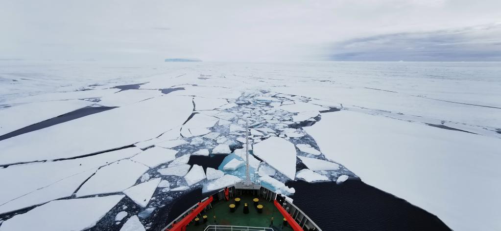 “雪龙”号在南极周边破冰前行。受访者供图