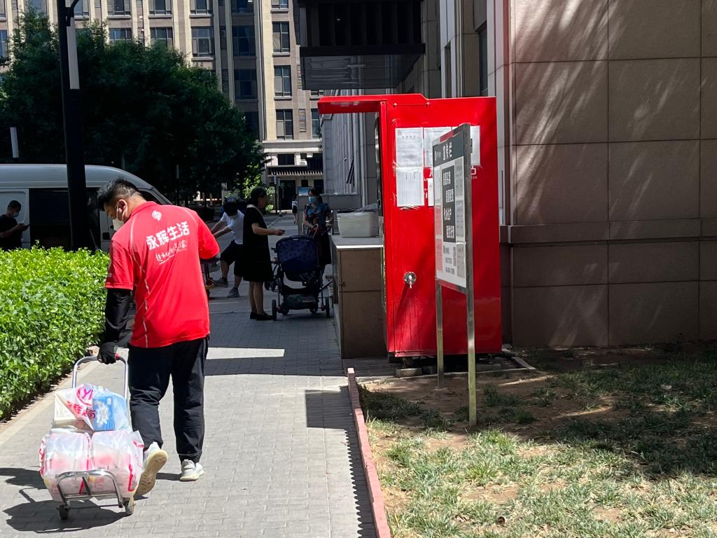 6月6日,外卖小哥在大兴区保利春天派小区内开展派送服务。(孙彤摄)