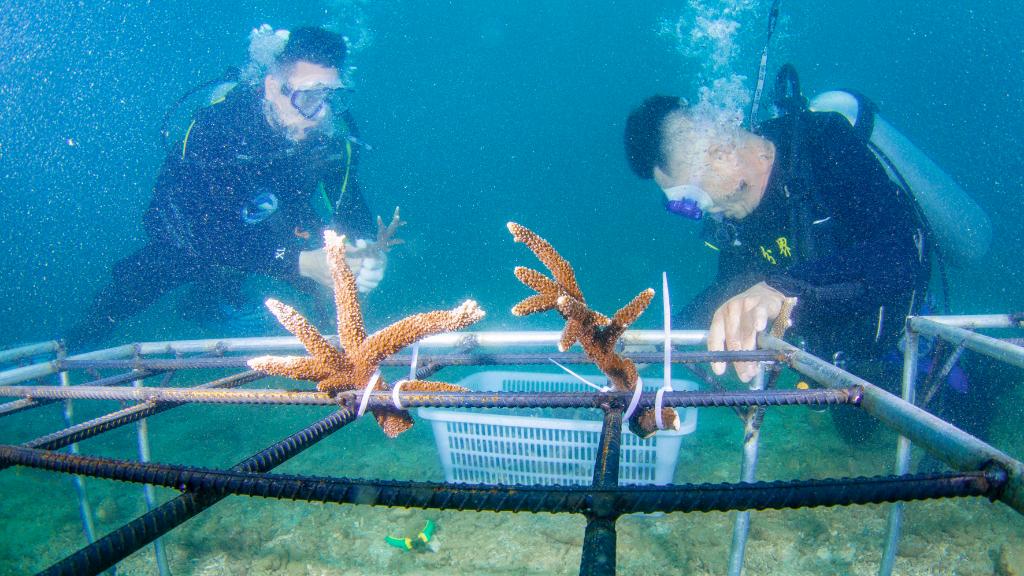 6月7日,海南省海洋与渔业科学研究院的专家和分界洲岛旅游区工作人员在移植珊瑚。新华社记者张丽芸 摄