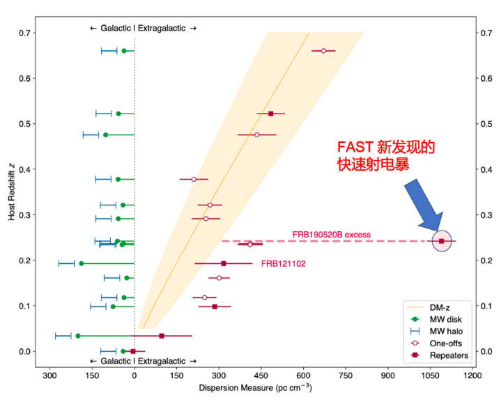 从色散-红移关系上清晰可见FRB 20190520B拥有最大的宿主星系电子密度。(中国科学院国家天文台供图)