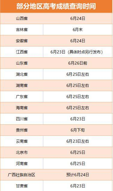 其中,江西、甘肃等省份的查分时间都在6月23日,安徽、山西等地为6月24日,北京、河南等地为6月25日。