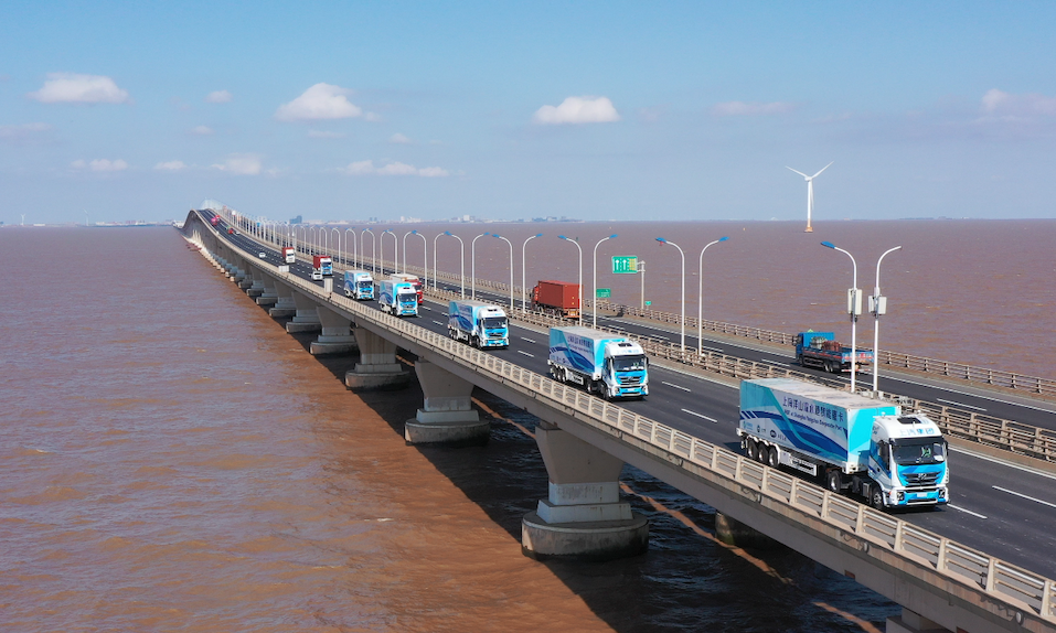 东海大桥上,友道智途5G+L4智能重卡正在列队通行。(受访对象供图)