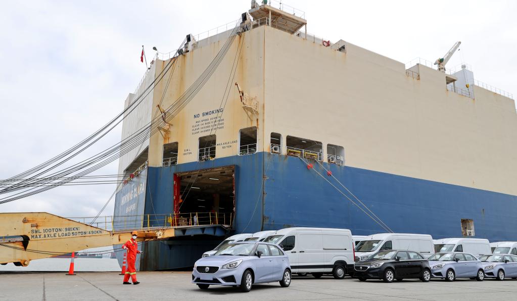 5月25日,在位于上海外高桥的上海海通国际汽车码头,汽车滚装船在装载完包括1000多辆上汽集团自主品牌名爵和大通新车在内的3000多辆汽车后,出发前往澳大利亚。新华社记者 方喆 摄