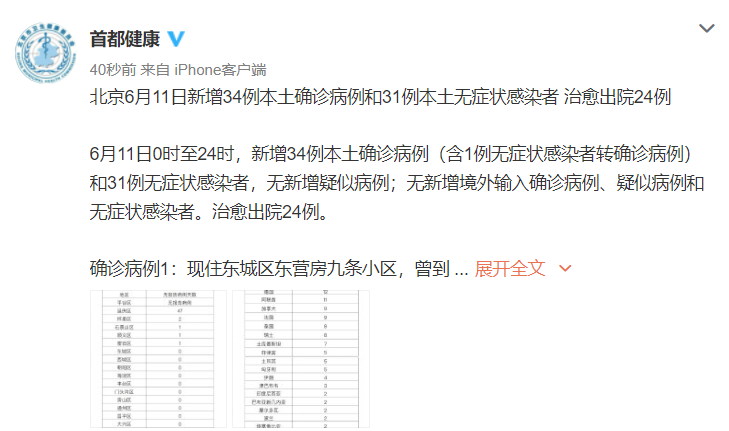 原标题:北京6月11日新增34例本土确诊病例和31例本土无症状感染者 治愈出院24例
