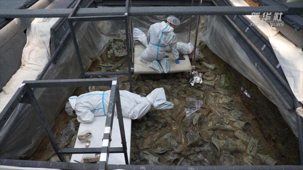 此次公布的文物主要集中在7、8号“祭祀坑”。其中7号“祭祀坑”发现了被考古学家称为“月光宝盒”的龟背形网格状器,成捆的长条状玉凿、三孔玉璧形器、玉斧、玉瑗,铜顶璋龙形饰、小件的青铜凤鸟、青铜立人、铜铃等。与7号“祭祀坑”邻近的8号“祭祀坑”大件青铜器更多,包括金面罩铜头像、顶尊蛇身铜人像、精妙复杂的铜神坛、“机器狗”一样的铜巨型神兽、铜龙、“裹裙坎肩大背头”的铜立人像、铜猪鼻龙形器、铜戴象牙立人像、铜神殿形器盖、石磬等,数件文物都是世界上首次发现。