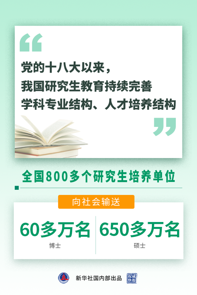 新华社北京6月14日电(记者王鹏)党的十八大以来,我国研究生教育持续完善学科专业结构、人才培养结构,全国800多个研究生培养单位向社会输送60多万名博士和650多万名硕士,为党和国家事业发展提供了有力人才支撑。