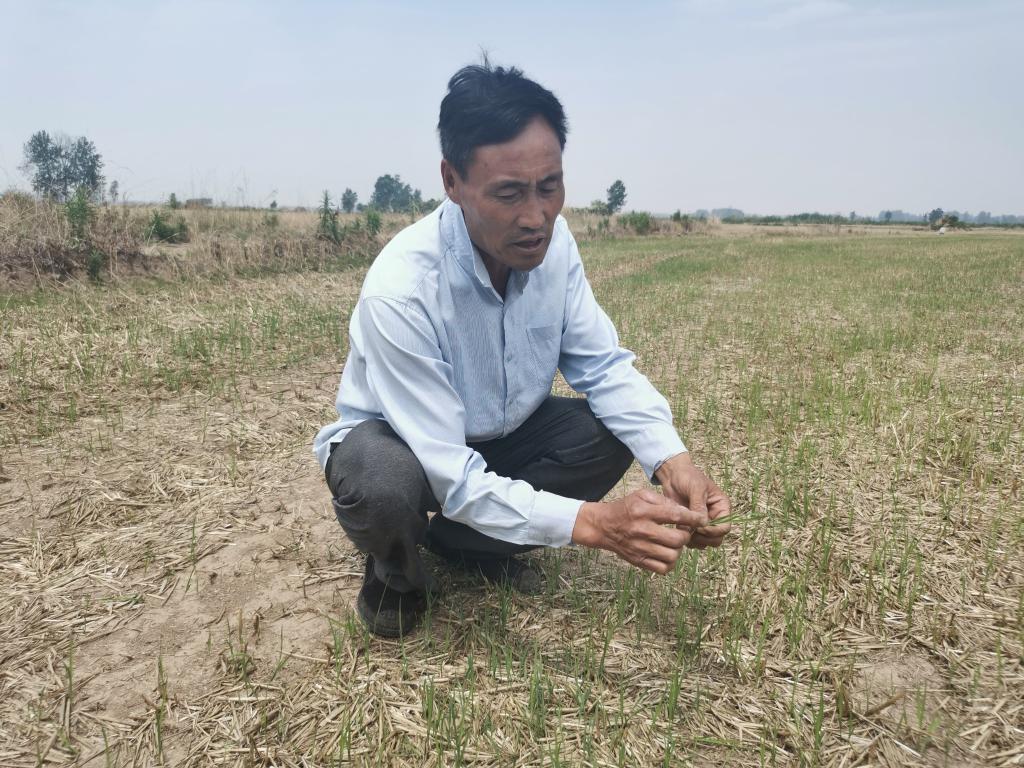 在霍邱县城西湖乡老滩村,种粮大户李士银在田里查看水稻秧苗。 新华社记者 姜刚 摄