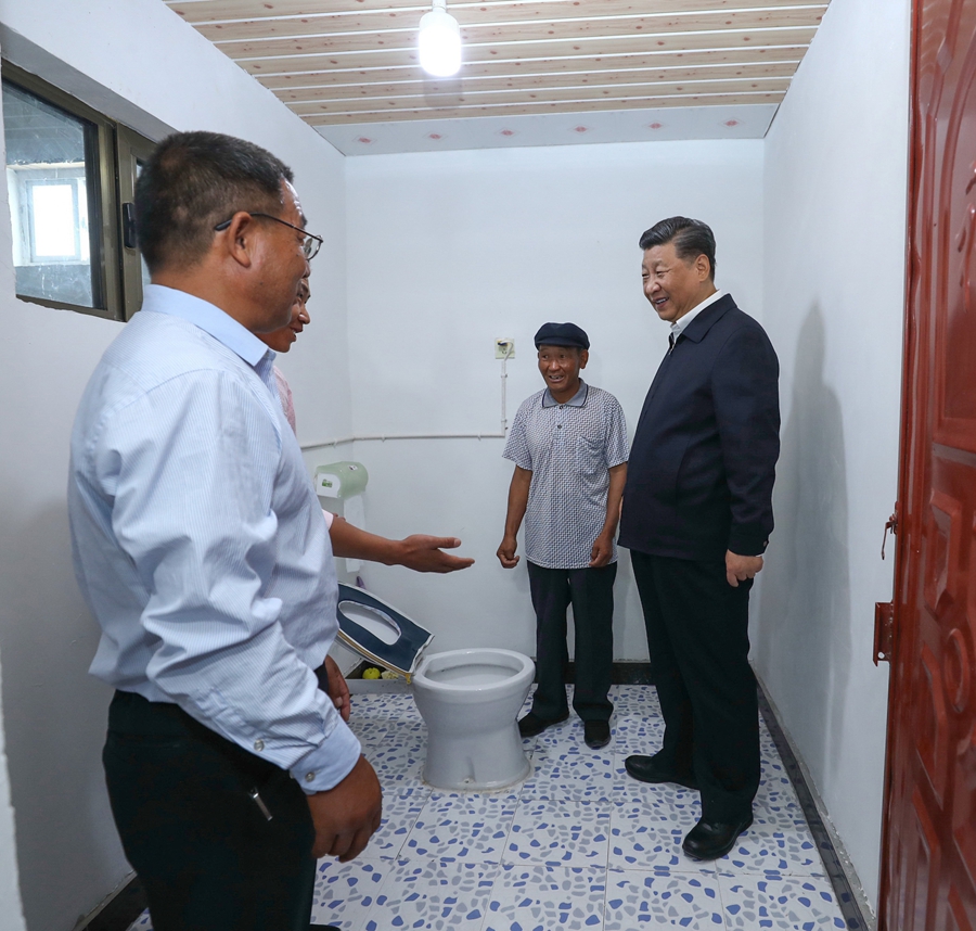 ↑2019年7月15日,习近平在内蒙古自治区赤峰市喀喇沁旗河南街道马鞍山村村民张国利家察看厕所情况。