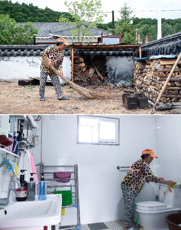 ↑拼版照片:上图为吉林省图们市石岘镇水南村村民康顺姬在打扫院子里的旱厕旧址;下图为康顺姬在打扫室内厕所(2021年8月3日摄)。水南村的室内卫生厕所改造率达100%。