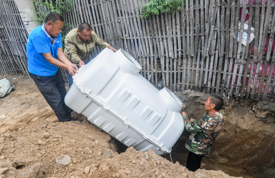 ↑河北省永清县三圣口乡赵家场一村施工人员在安装化粪池(2019年9月10日摄)。