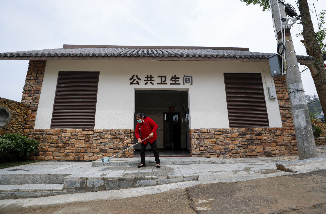 ↑重庆市沙坪坝区中梁镇龙泉村村民吴桂慧在打扫村里的公厕(2020年4月8日摄)。