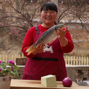 陕北霞姐(王敏)在自家院内做鱼。(受访者供图)