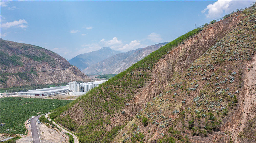这是云南省昆明市东川区蒋家沟附近运用“漏斗底鱼鳞坑整地技术”种植的树林,远处是泰国正大集团蛋鸡全产业链扶贫项目(6月1日摄,无人机照片)。新华社记者 胡超 摄