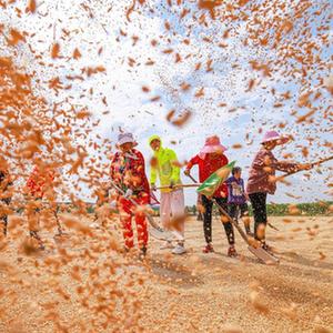 6月13日,在山东省荣成市上庄镇大李家村晾晒场,村民们在晾晒小麦。(新华社发)
