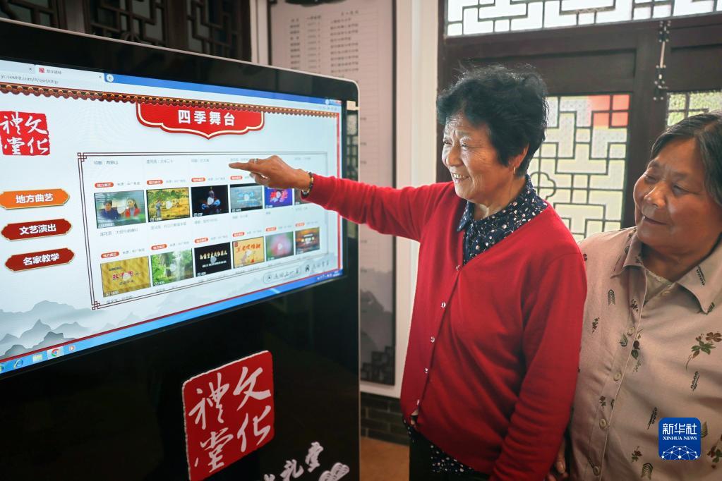 6月13日,在浙江省绍兴市越城区马山街道尚巷村文化礼堂,村民使用智慧触摸屏观看戏曲视频。新华社发(黄叶华 摄)