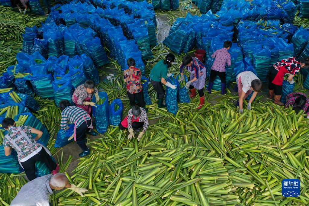2021年8月25日,在浙江省丽水市景宁畲族自治县大漈乡大漈村茭白交易市场,村民将新收割的茭白打包冷藏(无人机照片)。新华社发(李肃人 摄)