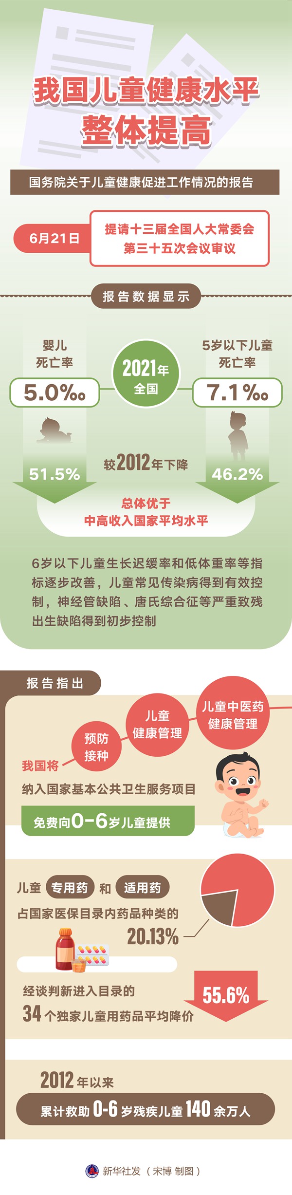 新华社北京6月21日电(记者李恒)国务院关于儿童健康促进工作情况的报告21日提请十三届全国人大常委会第三十五次会议审议。报告显示,党的十八大以来,我国儿童健康工作投入力度持续加大,政策体系不断完善,儿童健康水平整体明显提高。