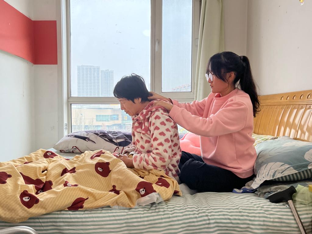 刘羲檬给妈妈按摩。新华社记者杨思琪 摄