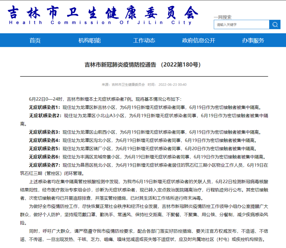 6月22日0—24时,吉林市新增本土无症状感染者7例。现将基本情况公布如下: