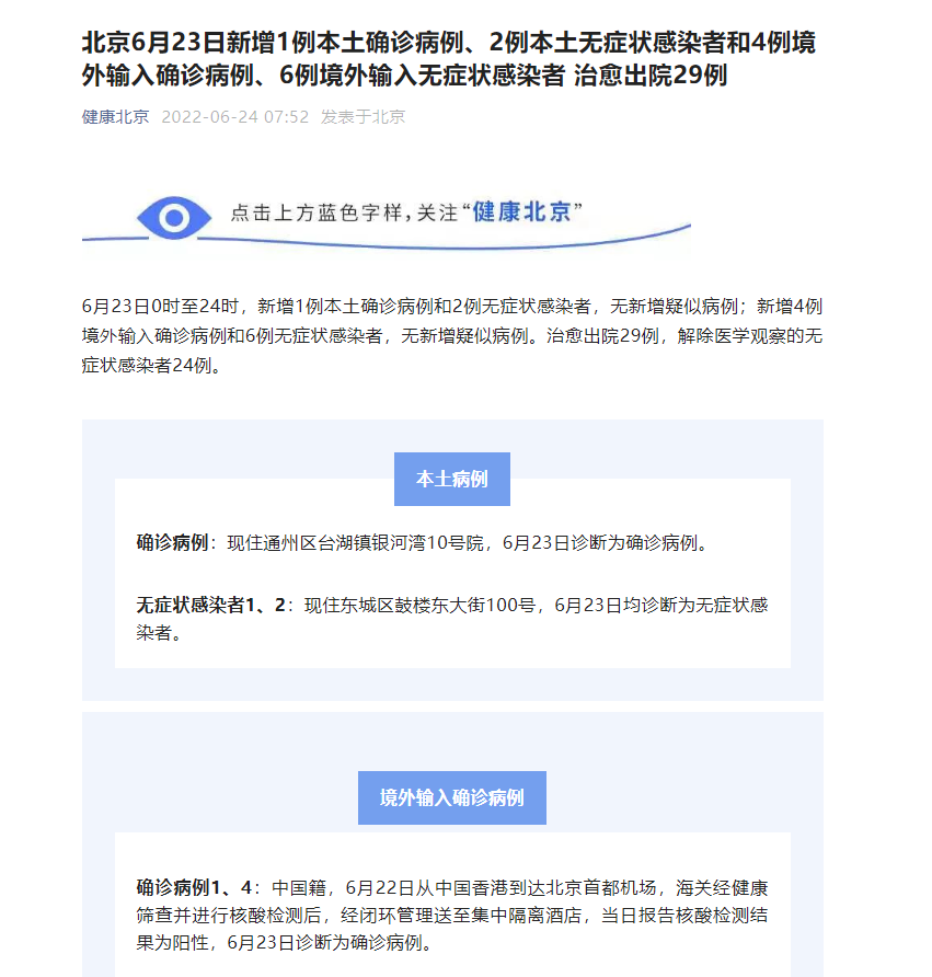 6月23日0时至24时,北京新增1例本土确诊病例和2例无症状感染者,无新增疑似病例;新增4例境外输入确诊病例和6例无症状感染者,无新增疑似病例。治愈出院29例,解除医学观察的无症状感染者24例。