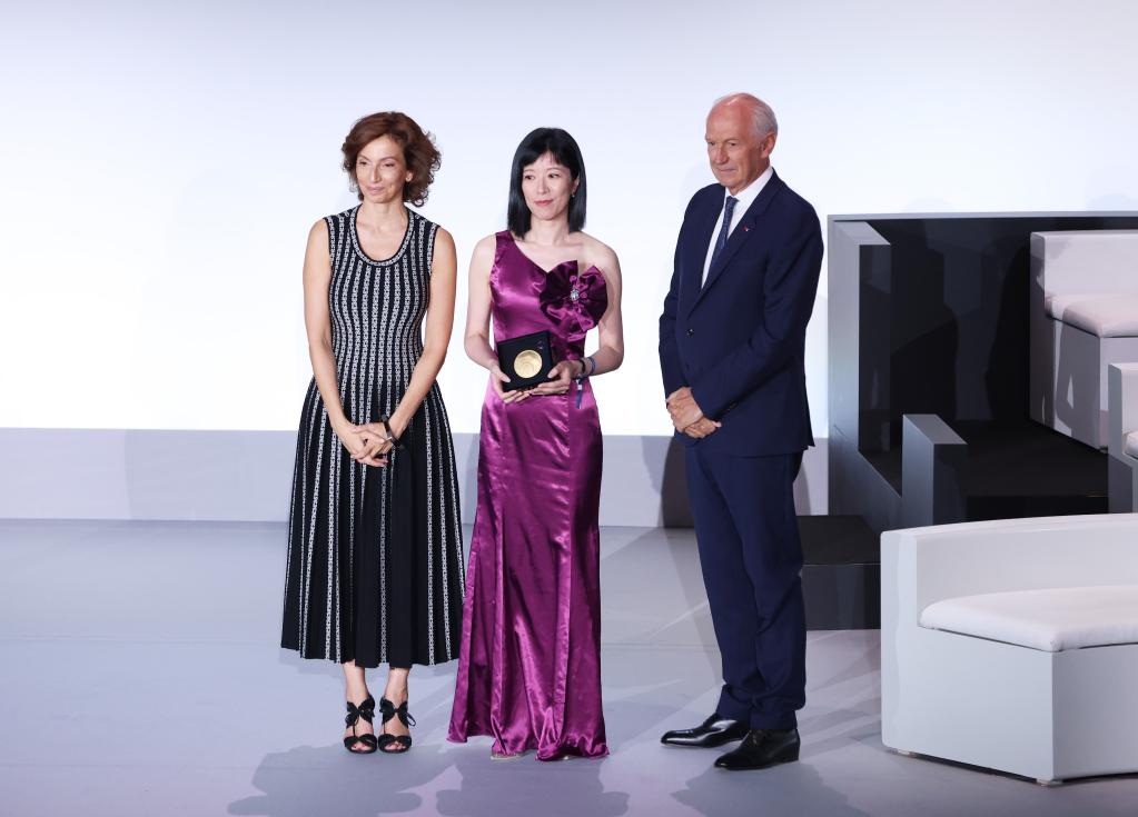 2022年6月23日,在位于法国巴黎的联合国教科文总部,胡海岚(中)获颁“世界杰出女科学家奖”。(新华社记者高静摄)