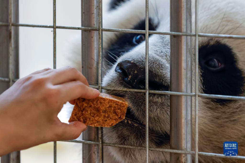 “崽崽,来吃饭了。”中华大熊猫苑神树坪基地的饲养员郎舜筠亲切地呼唤着,将切好的胡萝卜、馒头等端到大熊猫的圈舍。