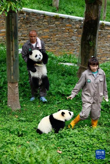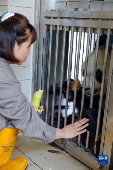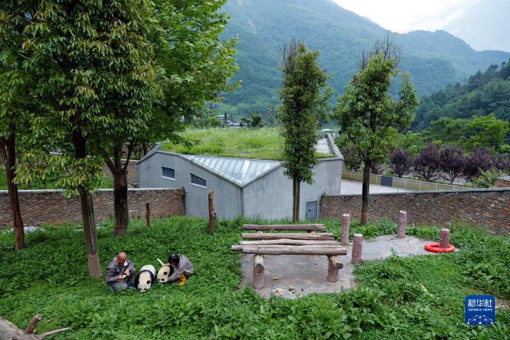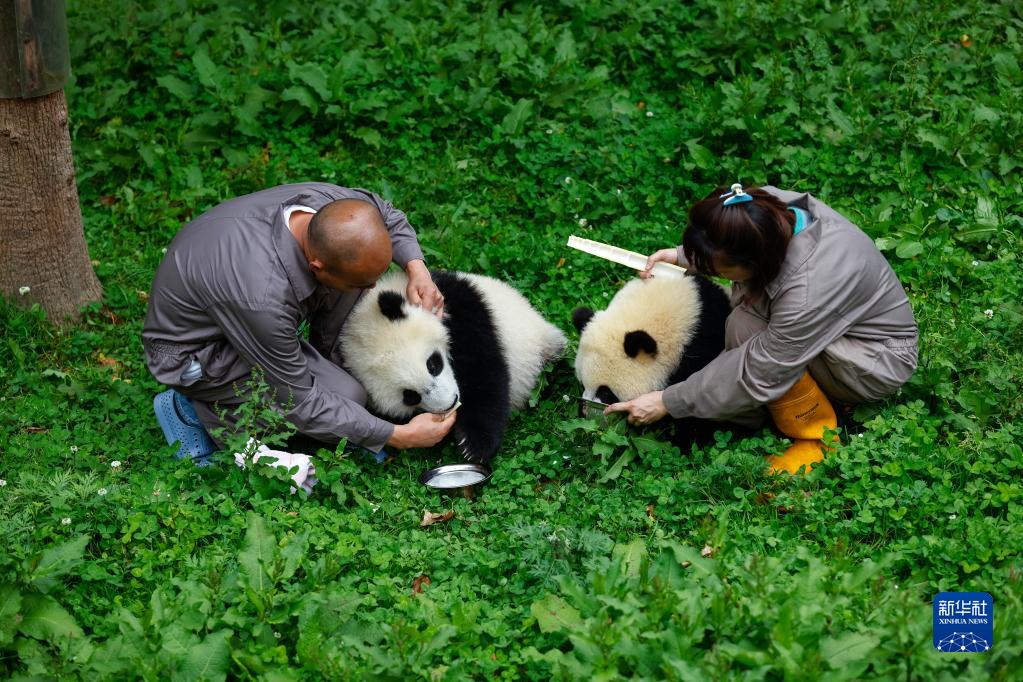 6月21日,在位于四川卧龙自然保护区内的中国大熊猫保护研究中心卧龙神树坪基地,饲养员郎舜筠与同为饲养员的丈夫董超在给大熊猫幼崽喂奶。新华社记者 沈伯韩 摄