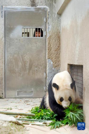 6月21日,在位于四川卧龙自然保护区内的中国大熊猫保护研究中心卧龙神树坪基地,饲养员郎舜筠在给大熊猫“盼月”喂了新鲜竹子后观察其进食情况。新华社记者 沈伯韩 摄