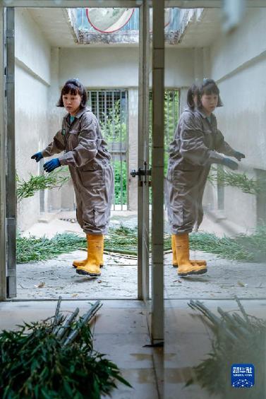 6月21日,在位于四川卧龙自然保护区内的中国大熊猫保护研究中心卧龙神树坪基地,饲养员郎舜筠在清理圈舍里大熊猫“盼月”吃剩下的竹子,准备给它喂新鲜竹子。新华社记者 沈伯韩 摄