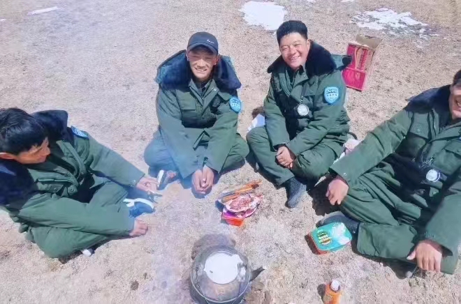 双湖县管护员在巡逻时用餐。(受访者提供)
