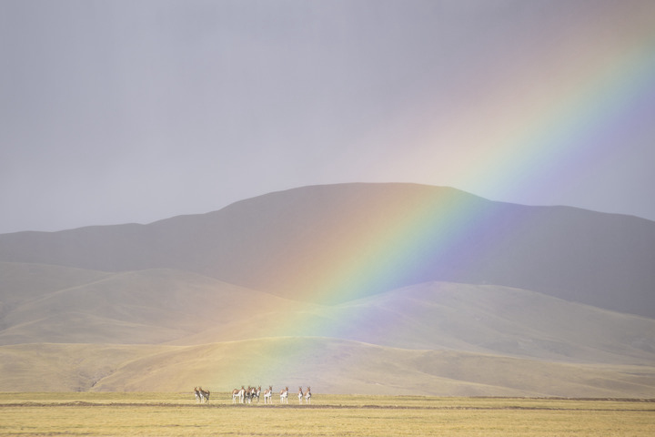 彩虹下的羌塘国家级自然保护区藏野驴。(新华社记者孙瑞博摄)