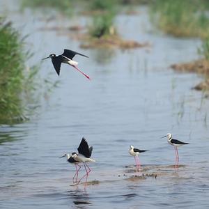 一群黑翅长脚鹬在南大港湿地水面嬉戏。新华社发(傅新春 摄)