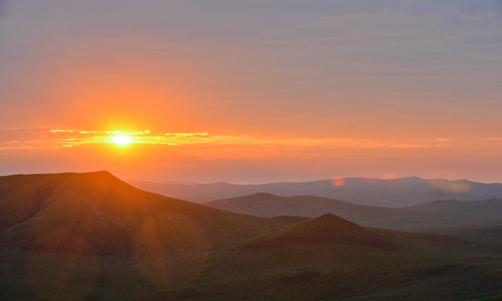 ↑内蒙古乌拉盖草原上的日出景象(2014年6月22日摄)。