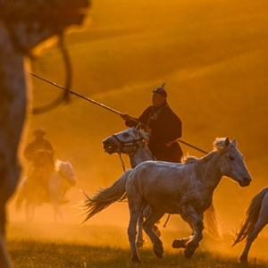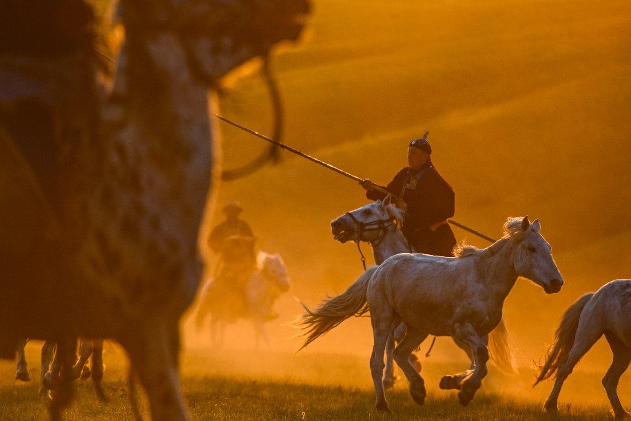 ↑2022年5月17日,牧民在内蒙古锡林郭勒盟西乌珠穆沁旗的草原上套马。