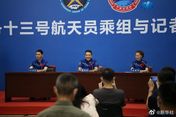 2022年6月28日下午,神舟十三号航天员乘组翟志刚、王亚平、叶光富返回 74 天后,在北京航天城与媒体记者见面。这是神舟十三号航天员乘组返回后首次与媒体和公众正式见面。