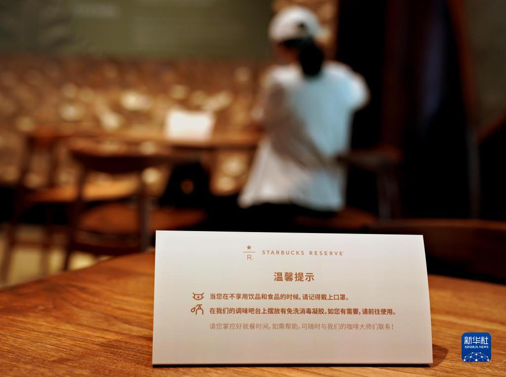 星巴克臻选上海烘焙工坊内的防疫提示(6月29日摄)。从6月29日开始,上海有序恢复餐饮堂食。新华社记者 刘颖 摄