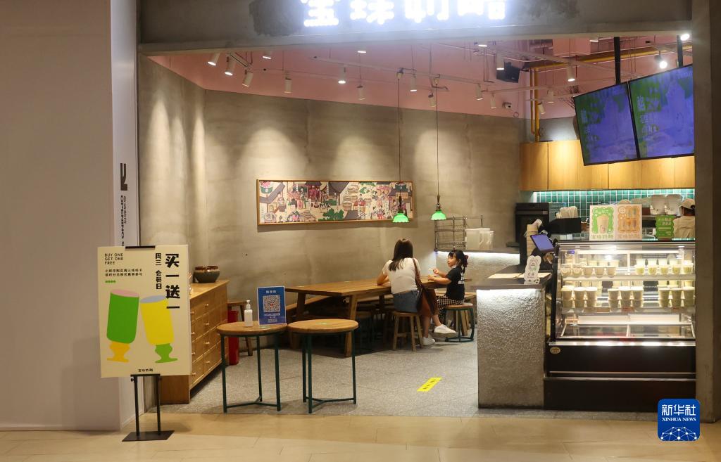 6月29日,顾客在上海市闵行区一家商场的甜品店内吃冰激淋。从6月29日开始,上海有序恢复餐饮堂食。新华社记者 方喆 摄
