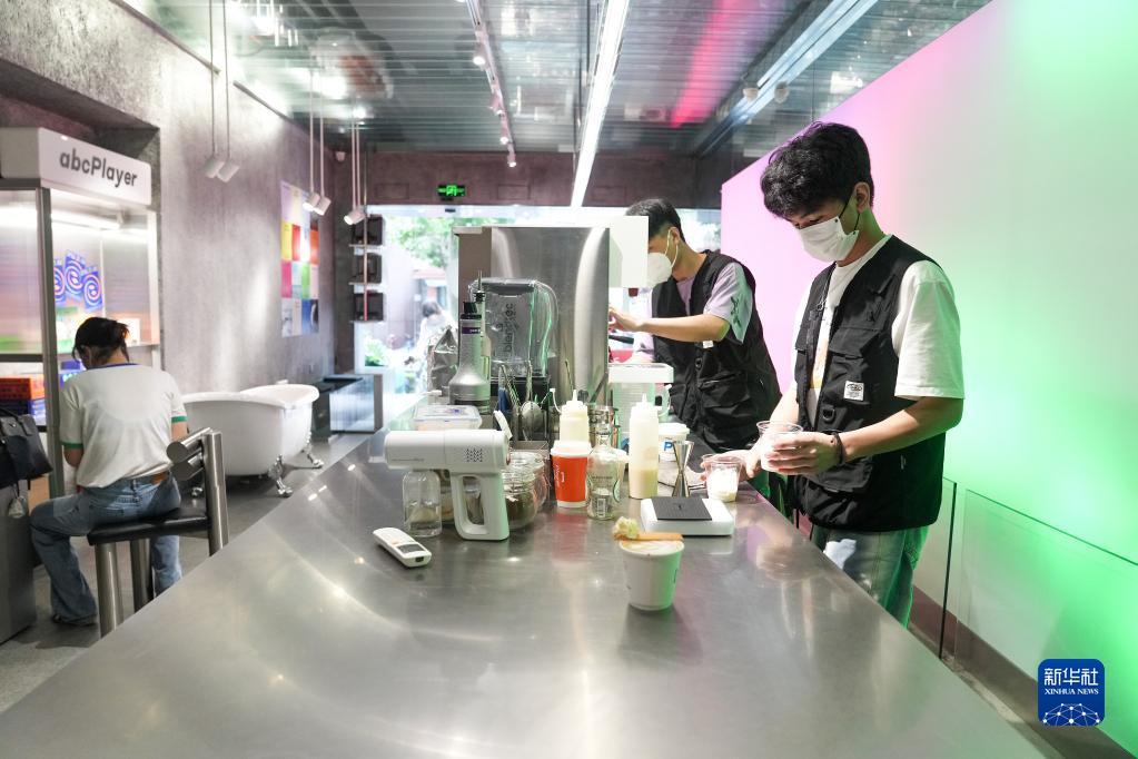 6月29日,在上海市愚园路的一家咖啡店内,店员为顾客制作咖啡。从6月29日开始,上海有序恢复餐饮堂食。新华社记者 丁汀 摄