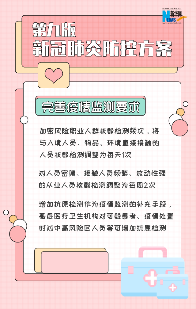 第九版新冠肺炎防控方案加密了风险职业人群的核酸检测频次,同时也增加抗原检测作为疫情监测的补充手段。主要修订内容如下: