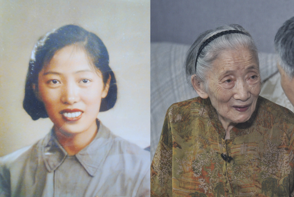 左图:20世纪50年代末,孙同郊照片。(资料照片)右图:6月23日,孙同郊在泸州家中与前来看望她的患者聊天。新华社记者 刘坤 摄
