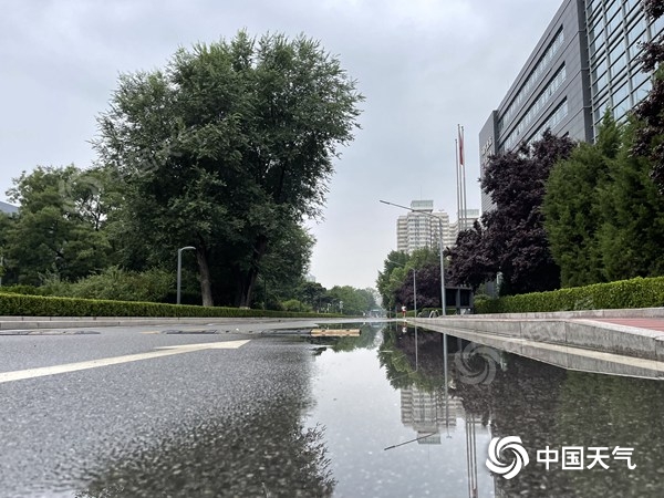 今晨,北京天空阴沉,路面积水。(图/中国天气网王晓)