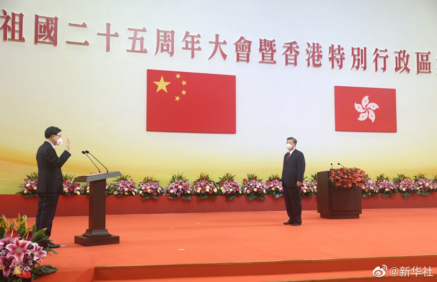 新华社快讯:习近平主席监誓,李家超宣誓就任香港特别行政区行政长官。(图片:新华社记者鞠鹏、丁海涛)