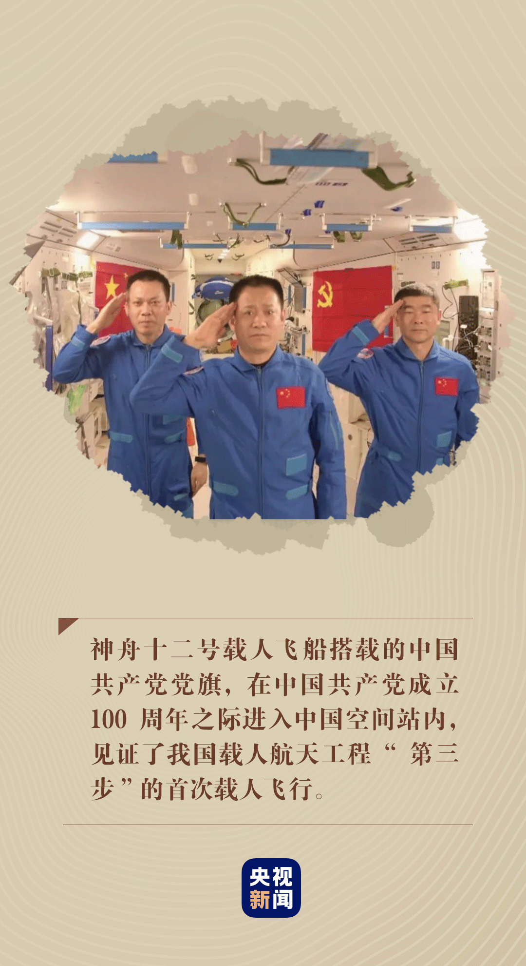 “祝伟大的中国共产党,生日快乐!”在中国共产党成立100周年之际,神舟十二号载人飞船航天员聂海胜、刘伯明、汤洪波,在距离地球390公里外的中国空间站天和核心舱传来视频祝福。在他们身后,党旗国旗耀眼夺目。