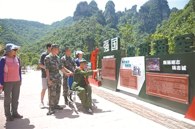 6月中旬,湖南省长沙市民李三元一家到张家界市武陵源区的十里画廊景区游览。听说这里新落成了一座国防教育体验园,一家人兴致勃勃入园参观,一同参加“国防达人”答题闯关游戏。“观光的同时学习国防知识,大人和孩子都受益匪浅。”李三元说。