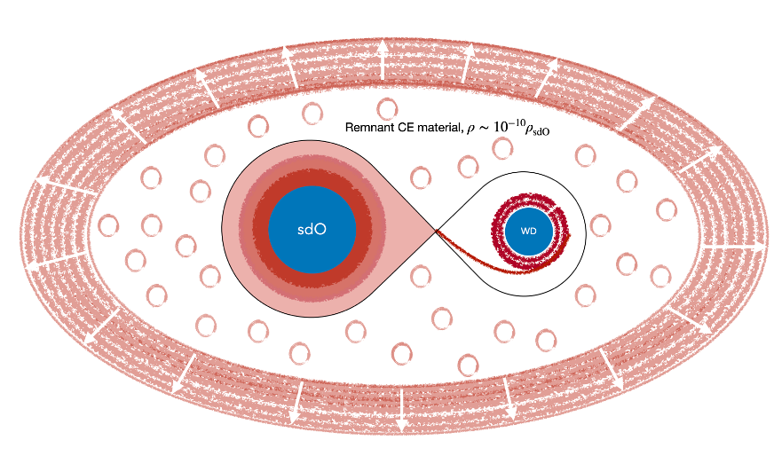 此项研究中,研究团队通过开普勒卫星和澳大利亚国立大学2.3米宽视场望远镜等的观测数据,发现了一个距离我们23000光年的密近热亚矮星双星J1920,两颗星之间的距离越来越近,它们的周围有一个正在膨胀的壳层,以大约每秒200公里的速度离开双星。这个膨胀的壳层被证明是大约1万年前被双星抛射的共有包层。