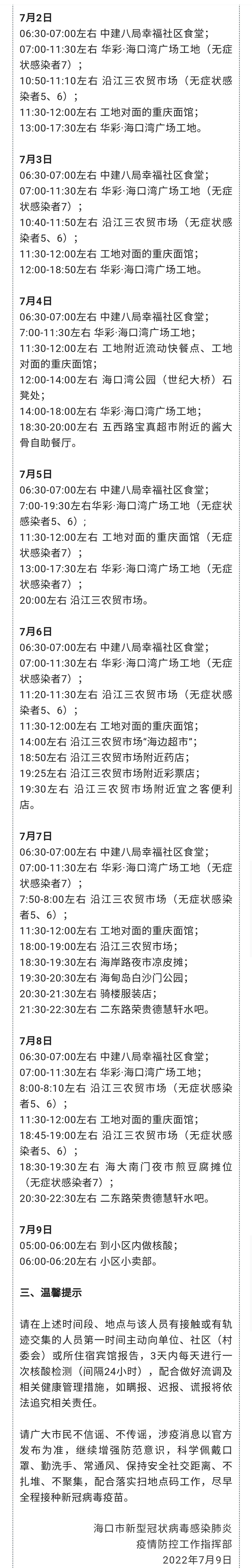 2022年7月9日晚,海南省海口市在已管控人群中检出3例新冠病毒阳性感染者,均为海口市今日上午发布无症状感染者的密切接触者,经医疗专家组诊断均为无症状感染者。7月9日以来,累计发现无症状感染者7例。