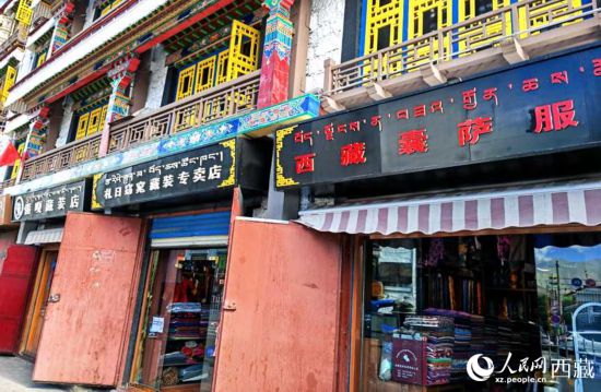 环绕拉萨八廓古城,开满了藏装店。人民网 李海霞摄