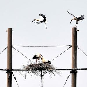在黄河三角洲自然保护区,电线杆上直径数米的东方白鹳的巢。新华社记者郭绪雷 摄