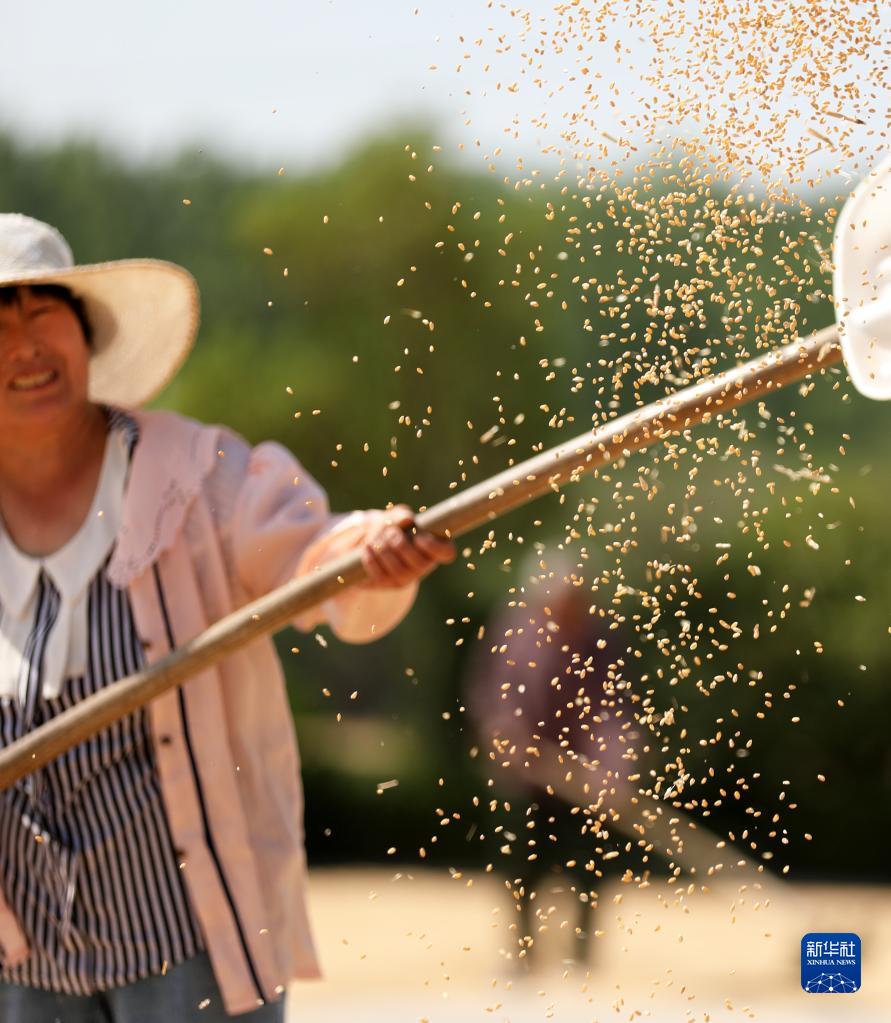 山东省临沂市郯城县郯城街道农民扬晒收获的小麦(2022年6月7日摄)。新华社发(张春雷摄)